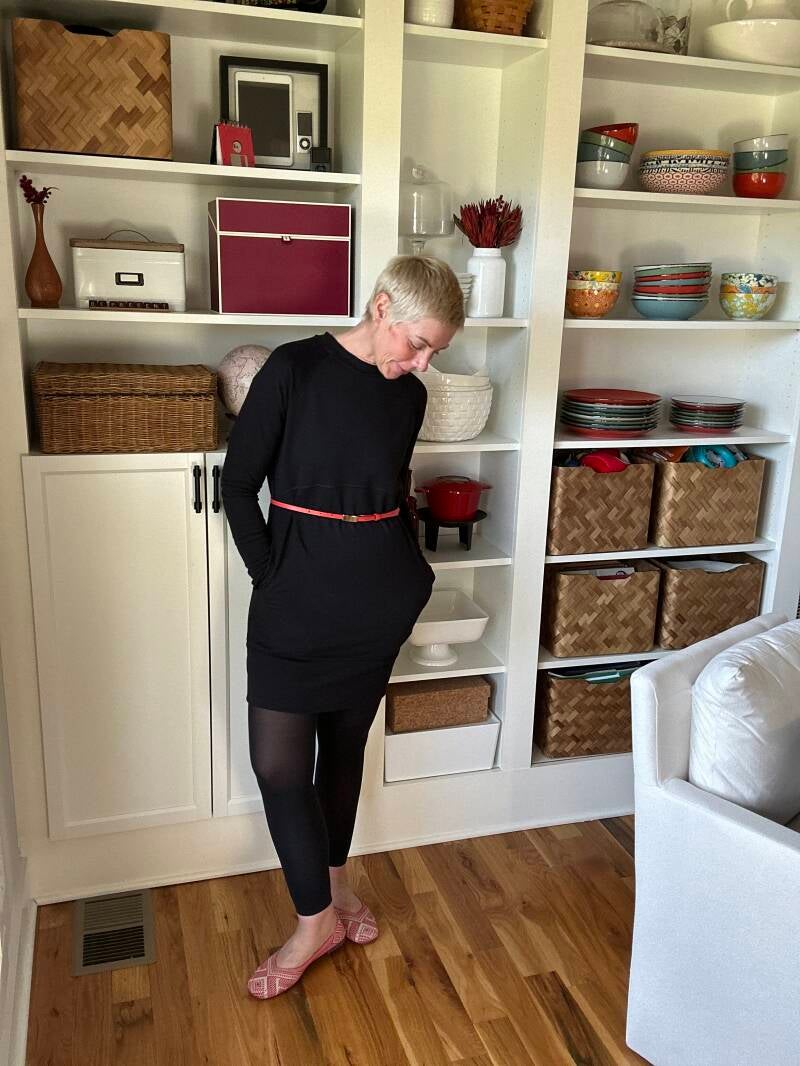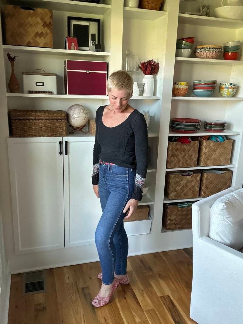 Although I'm not packing this top or these jeans (it's important to try on styles to see if they work on the body, not just conceptually!), this picture captures life as I pack. Milton the Morkie has been part of every step in the process, of course.